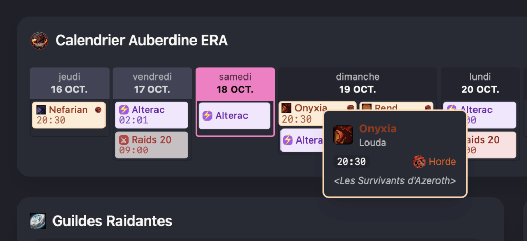 • Alimenter dynamiquement le calendrier communautaire du site (événements, foires, PVP, world buffs).