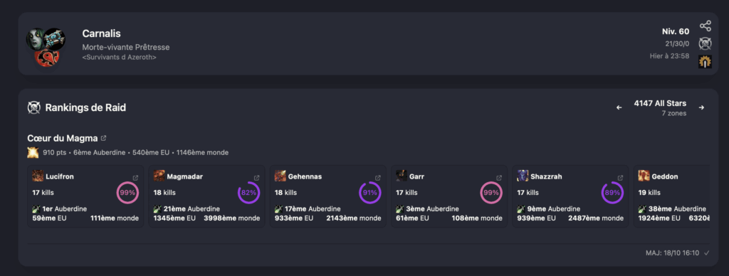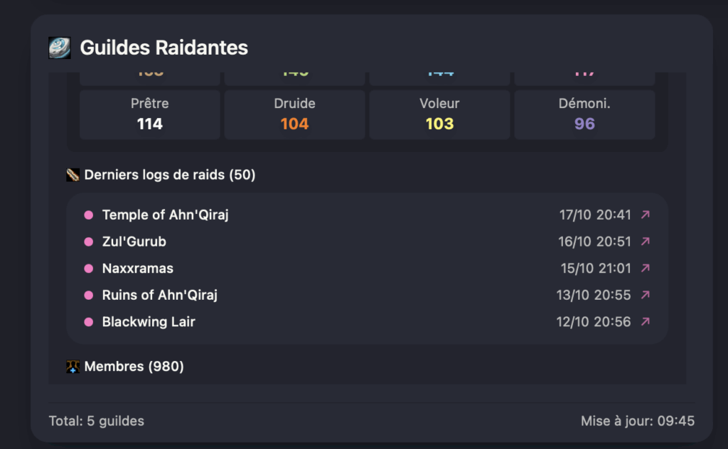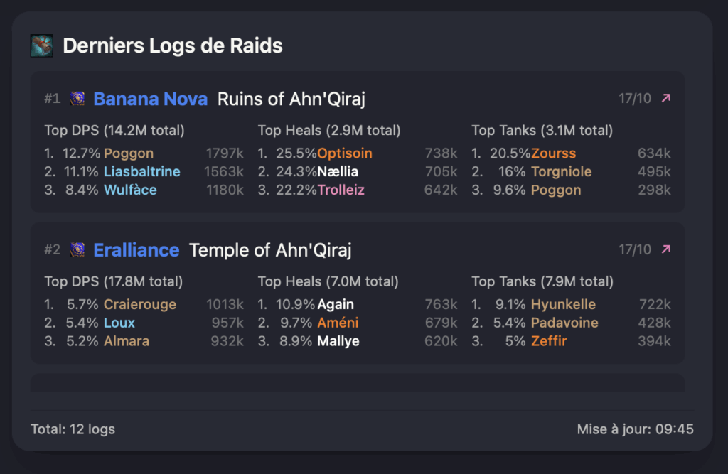 • L’API WarcraftLogs (WCL) pour croiser les performances PvE et constituer des profils détaillés.
