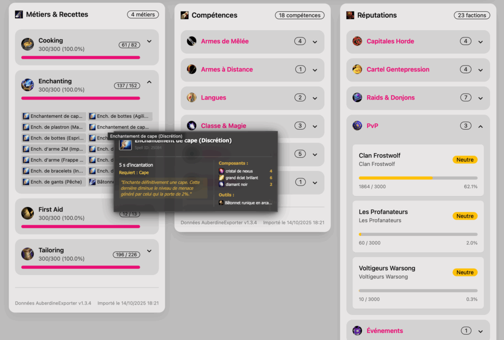• Un système d’import local via un addon WoW dédié, garantissant la fraîcheur et la véracité des données en provenance directe du jeu.