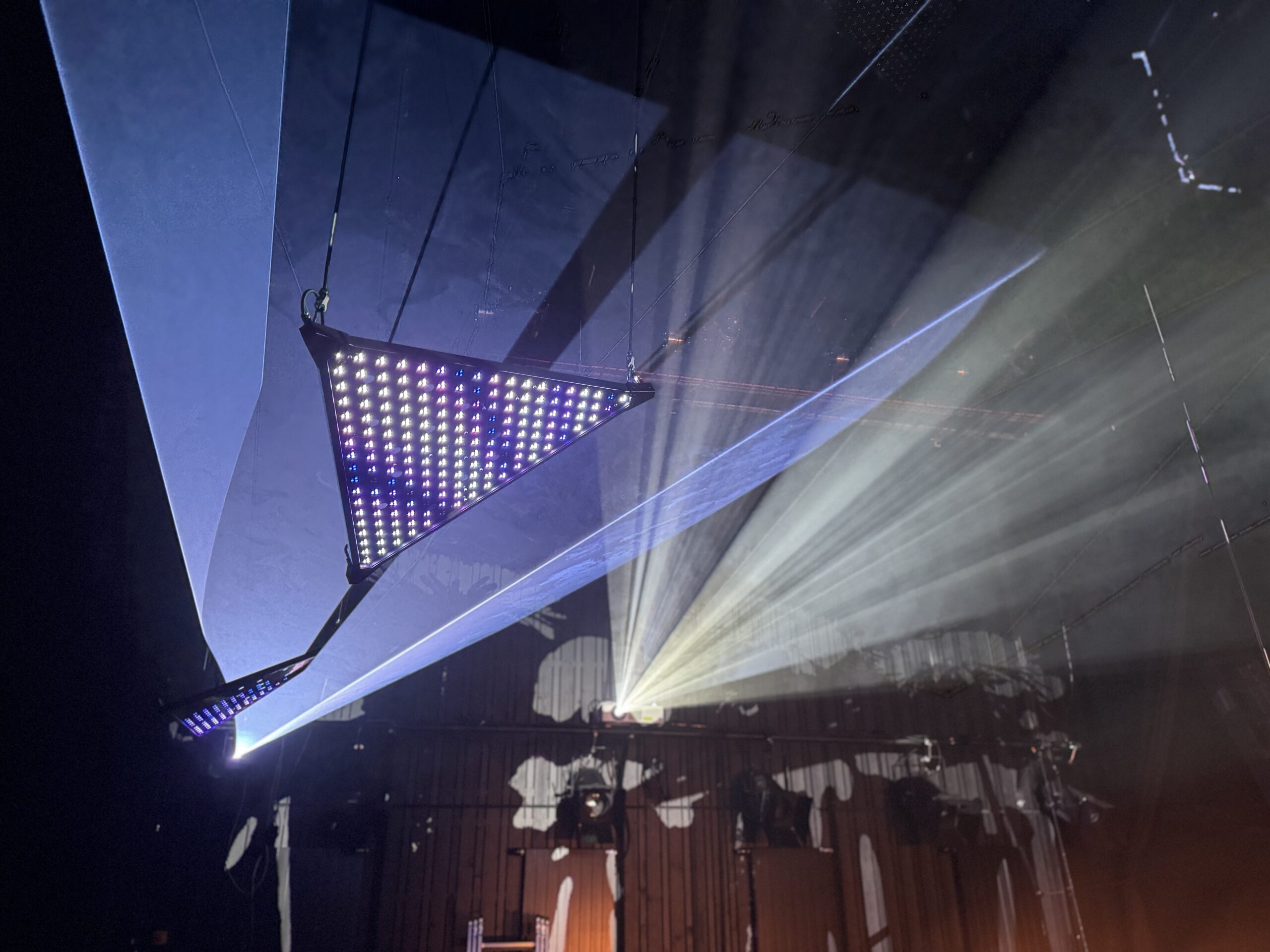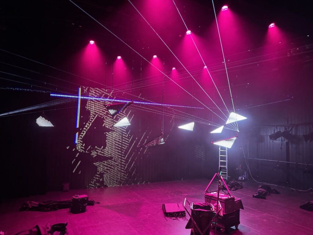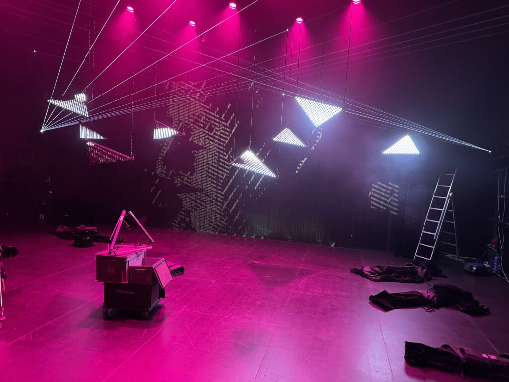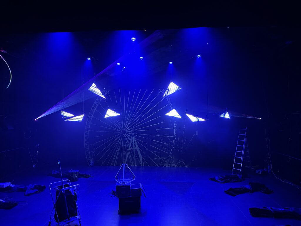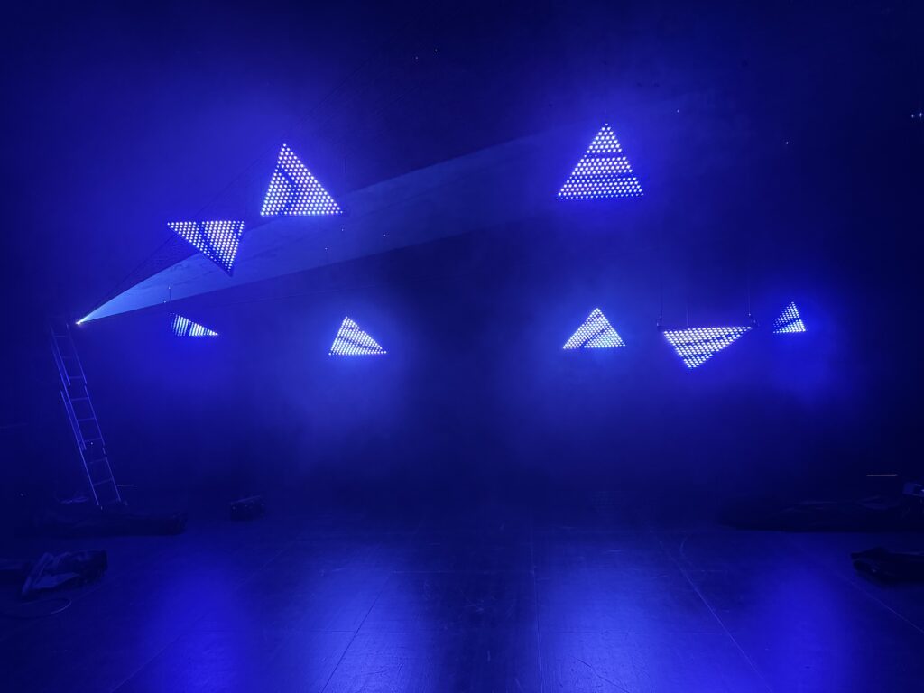 Premier projet scénique intégrant l’usage du laser depuis ma validation de compétence, le respect des contraintes en réflexions et en sécurité dans une petite salle était intéressant à gérer. L’usage des triangles LED a aussi été contraignant pour ne pas supplanter le jeu et le déroulé en scène.